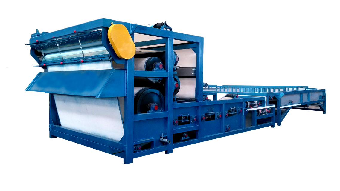 帶式壓濾泥漿脫水機(jī)是洛陽隆中重工在引進(jìn)國外壓濾技術(shù)基礎(chǔ)上研制成功的新機(jī)型,該設(shè)備是通過兩條濾帶纏繞在一系列順序排列、大小不等的輥輪上,利用濾帶間的擠壓和剪切作用,來脫除料漿中水分的一種壓濾設(shè)備,具有著能連續(xù)作業(yè)、自動化程度高、節(jié)能、使用維護(hù)方便等優(yōu)點,是一種進(jìn)行污泥脫水減量化處理的理想設(shè)備。